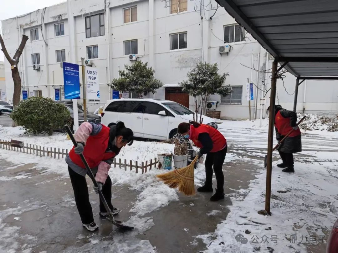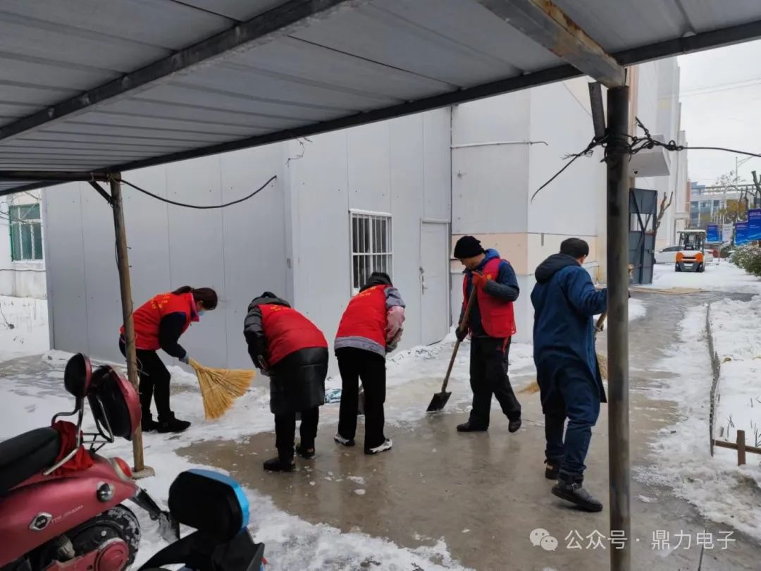 在掃雪過程中,黨員同志奮勇當(dāng)先,青年志愿者沖鋒在前,有的用鐵鍬向兩邊清理積雪,有的在后面奮力用掃把掃雪,積雪濺在衣服和鞋上也毫不在意,掃雪現(xiàn)場一片繁忙景象。一個多小時后,鼎力電子門前道路及車棚被清掃得干干凈凈。